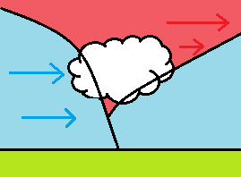 Op de weerkaart hiernaast staan alle fronten afgebeeld. We zien ook nog een blauwe convergentielijn. Dit is een front waar verschillende luchtsoorten samenkomen en daardoor opstijgen. Hierdoor ontstaan er (stevige) buien op dit front, een andere naam is 'trog'.