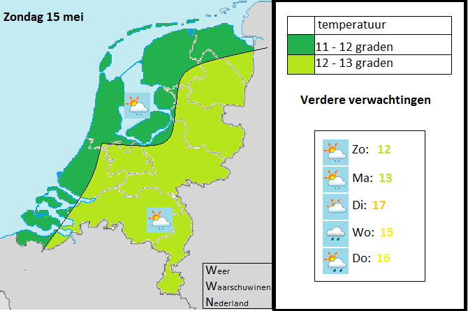 Na het Pinksterweekend wordt het iets warmer, maar wel wisselvalliger. Dinsdag wordt de beste dag, met grotendeels droog weer en soms wat zon. Vanaf woensdag gaat vaker regenen en vallen er soms stevige buien. De temperatuur komt iets hoger uit, meestal tussen 15 en 17 graden. Dit wisselvallige weer lijkt nog wat langer aan te houden, pas richting 23 mei kan het wat droger worden. De zomerse temperaturen van afgelopen dagen zien we voorlopig nog niet terug.